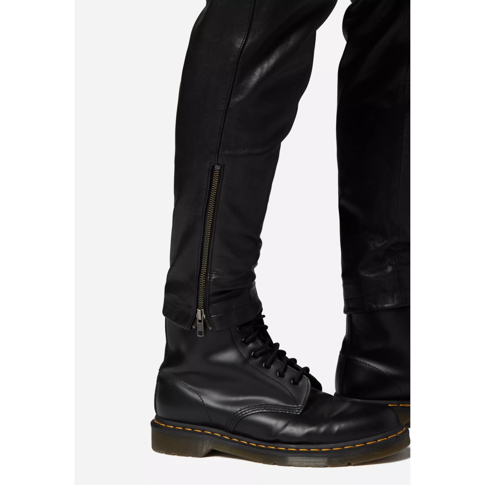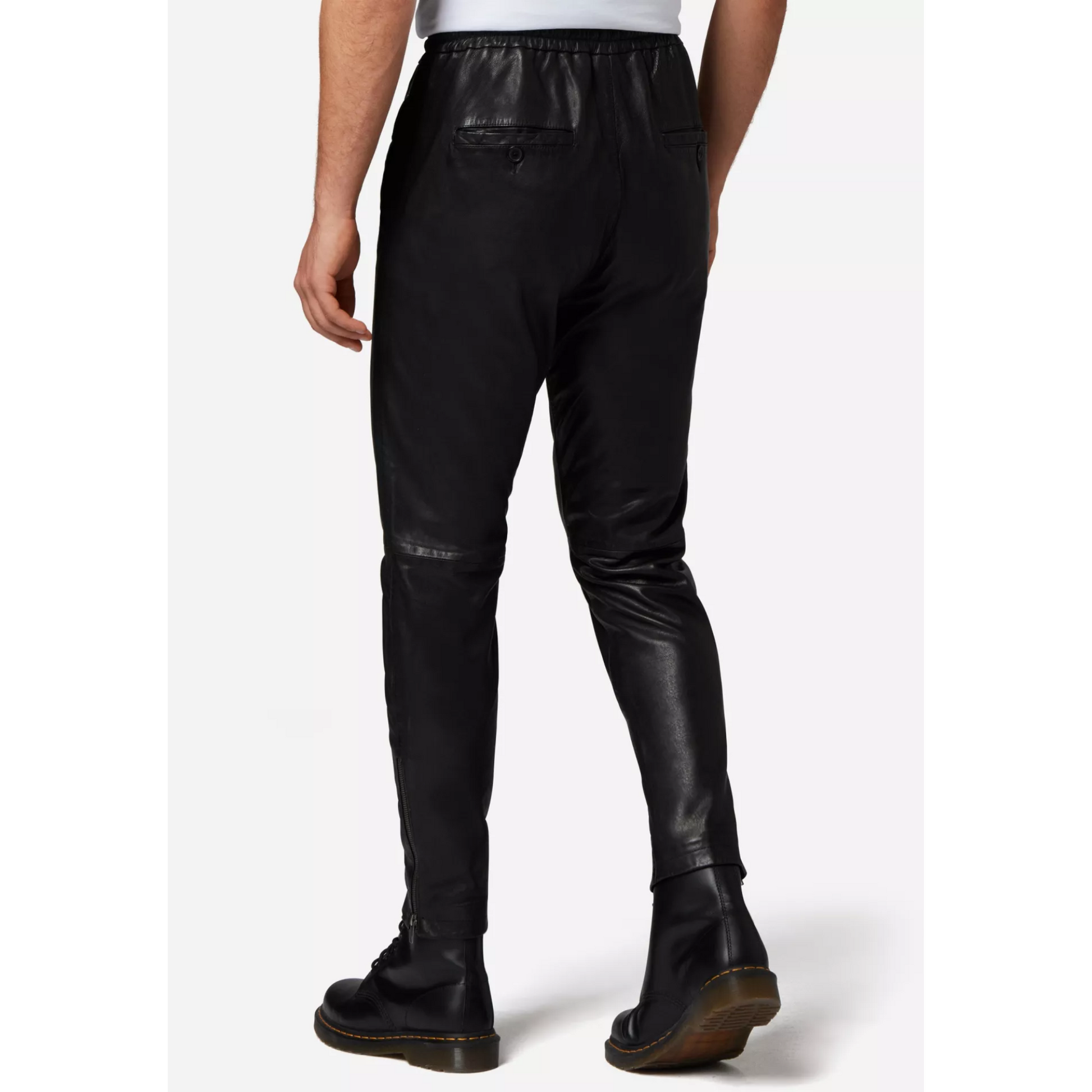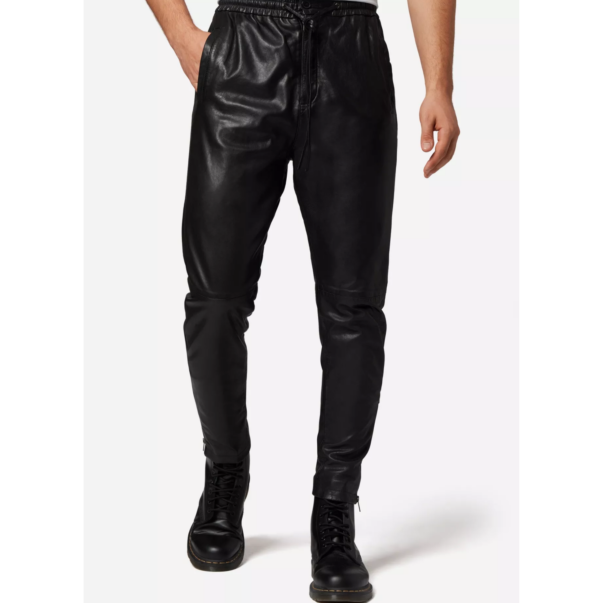 Los pantalones de cuero "Mike" se cierran de forma segura con una cremallera y un botón en la cintura. Además, cuenta con un cordón en la cintura para garantizar un ajuste individual y una comodidad óptima. La cremallera en los bajos de las piernas te permite llevar los pantalones sin esfuerzo sobre zapatos o botas y añade el toque final a tu conjunto.