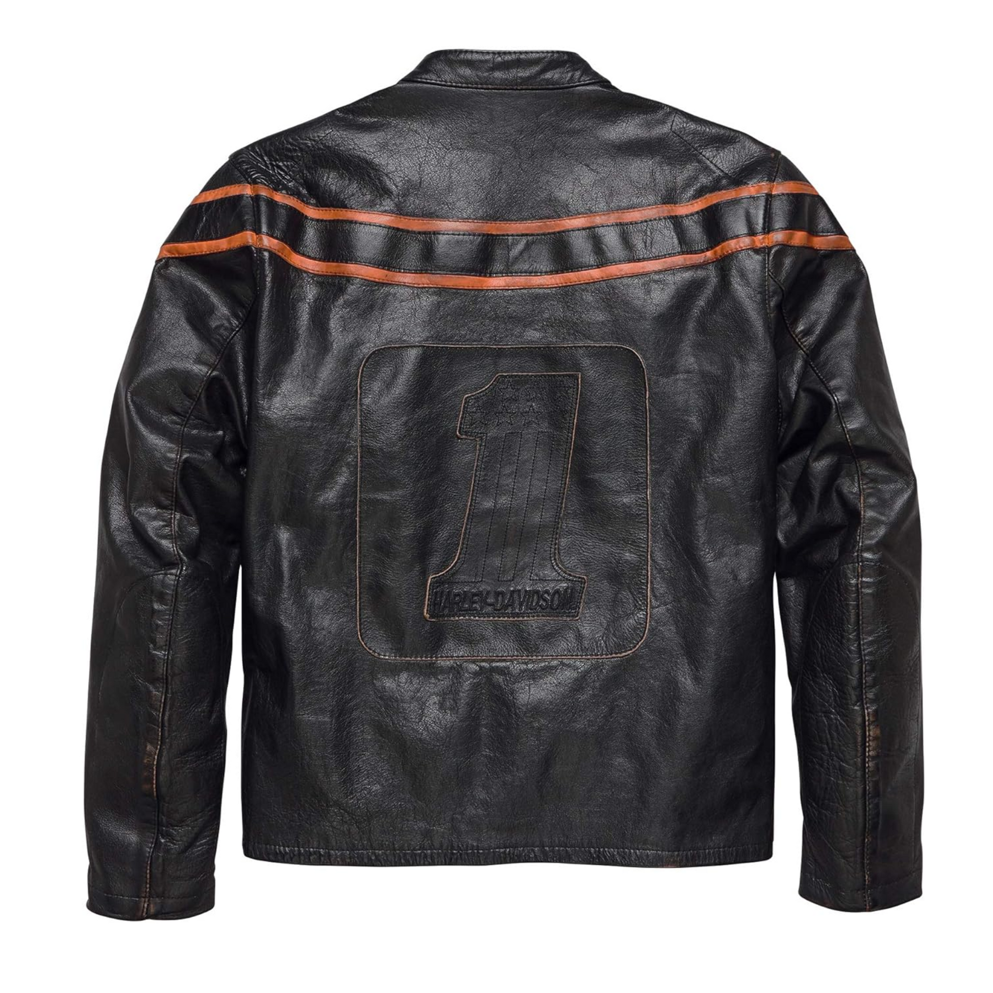 Embodying the spirit of Harley-Davidson's iconic style, this jacket features classic design elements such as the signature double-toned stripes across the chest and sleeves, paying homage to the brand's rich heritage. The asymmetrical zip closure, snap-tab collar, and zippered cuffs further enhance the jacket's rugged aesthetic, while providing added protection against the elements.
