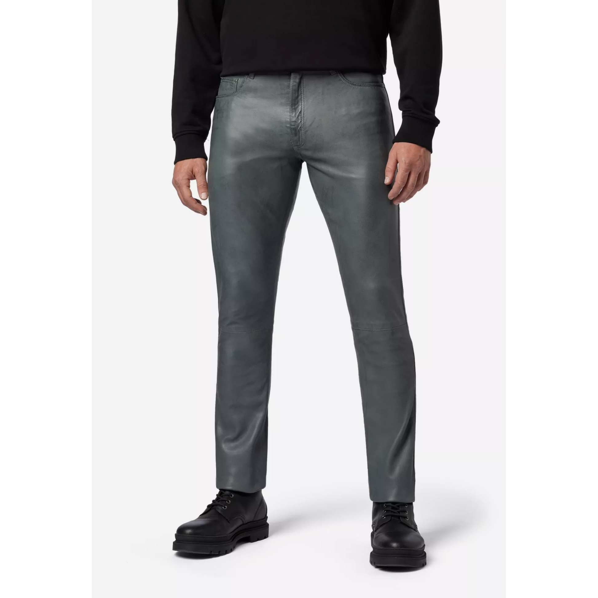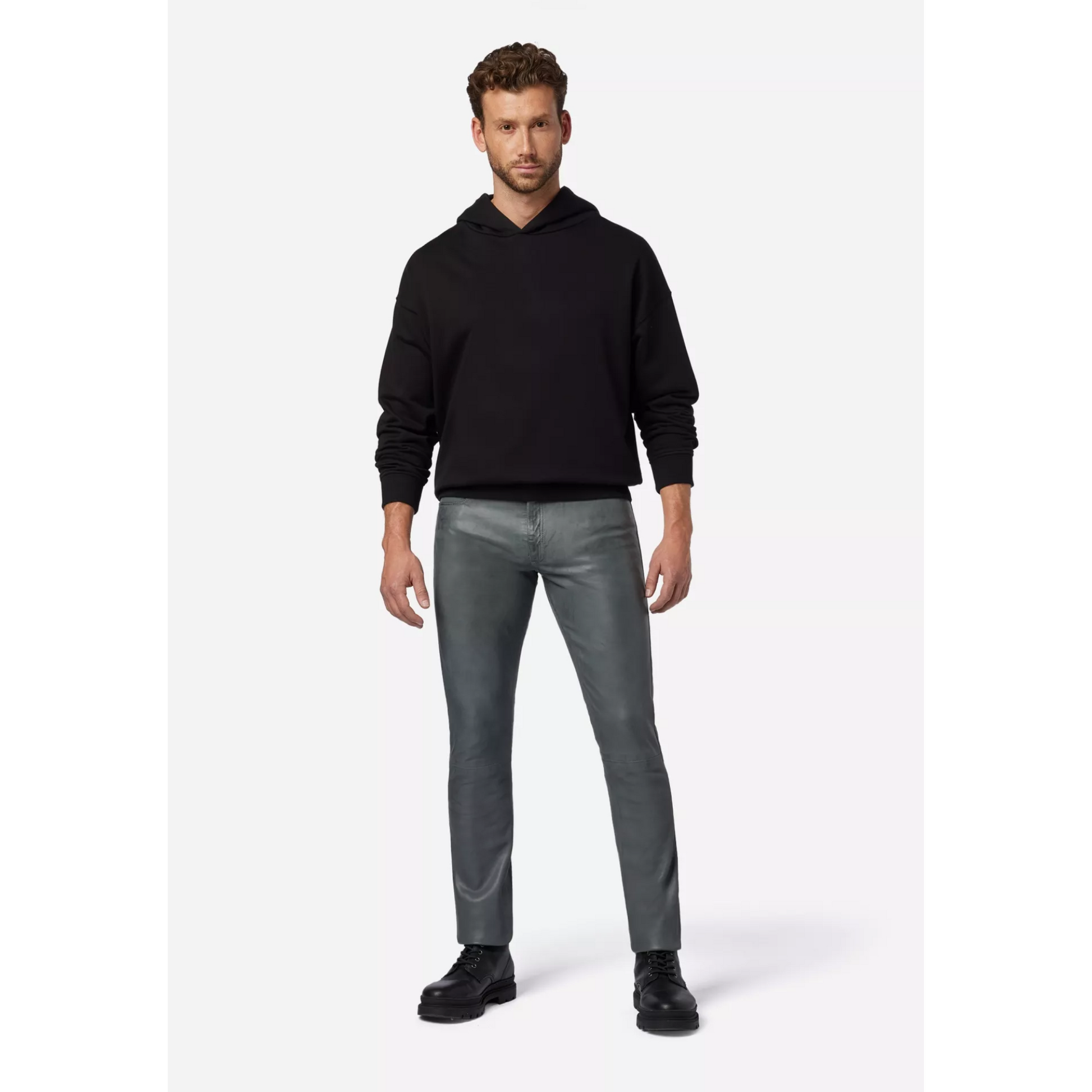Los pantalones de piel negros SLIM FIT son un modelo clásico con estilo de 5 bolsillos. Con dos bolsillos delanteros normales y uno pequeño, así como dos bolsillos traseros, los pantalones son prácticos y tienen el aspecto atemporal y moderno de los vaqueros. El cierre de cremallera y botón de metal, los dobladillos de los bolsillos remachados y las trabillas para cinturón encajan perfectamente en el look moderno. La piel de napa de cordero suave como la mantequilla y el forro de poliéster ofrecen el máximo confort y una sensación agradable en la piel. La pernera estrecha y recta está absolutamente de moda y garantiza una figura estupenda. ¿Por qué dejar unas piernas estupendas y esbeltas sólo a las mujeres? Luce sensacional, fresca y rocosa, informal y elegante, todo a la vez. ¡Solo unos pantalones de cuero que se ajustan perfectamente como SLIM FIT pueden lograr esto!