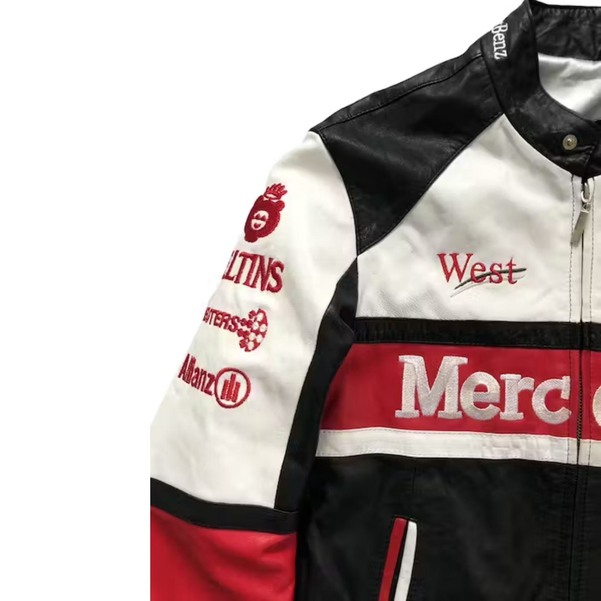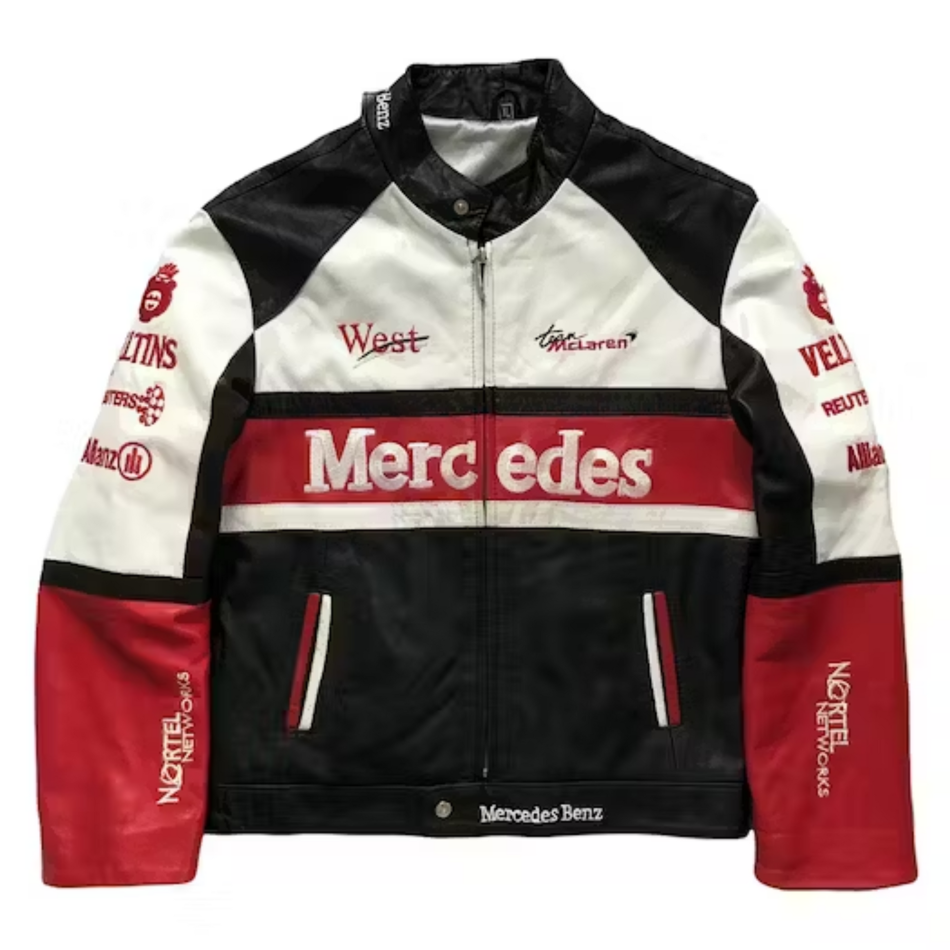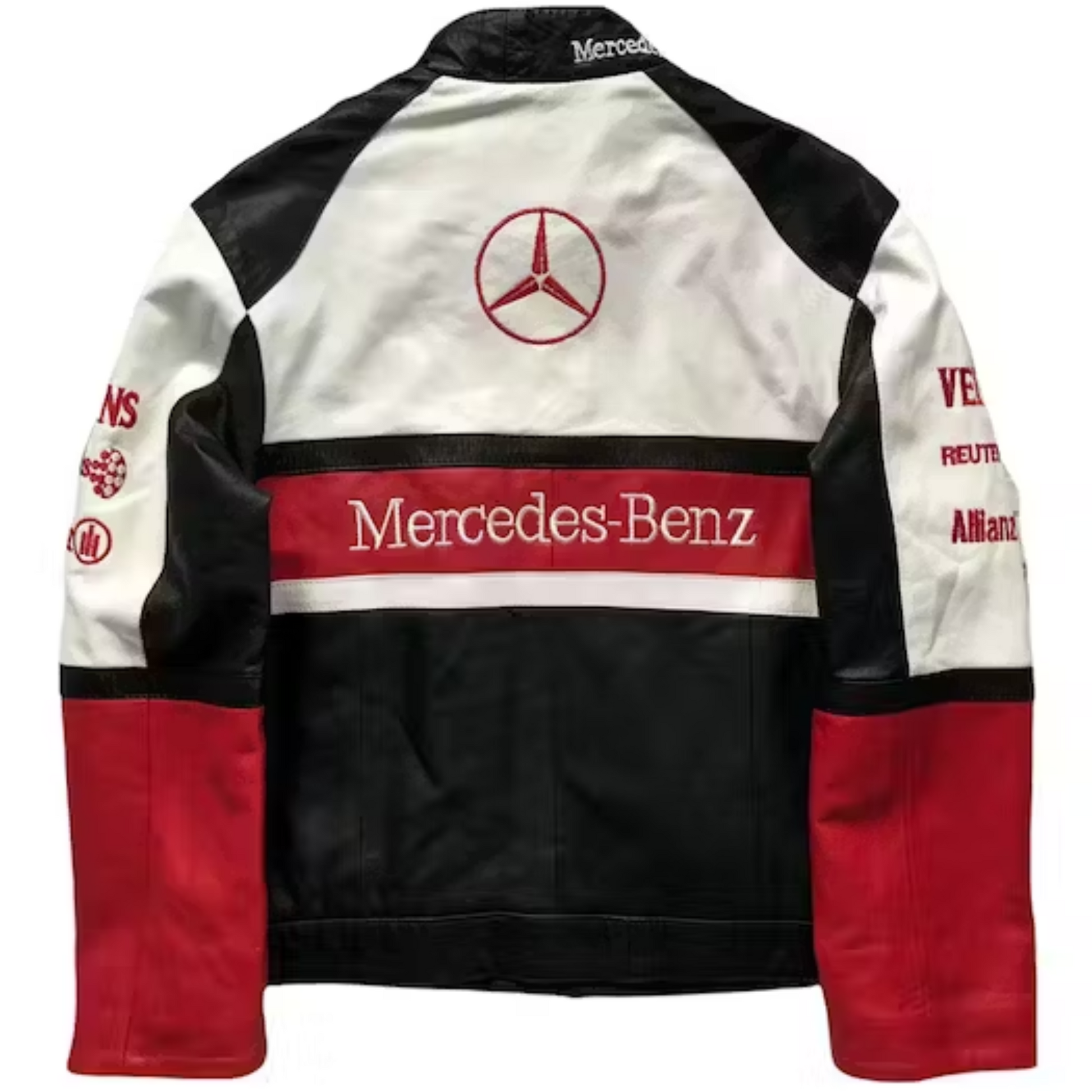 Men's Red Black Mercedes Benz F1 Racing Leather Jacket: Premium Motorsport Apparel