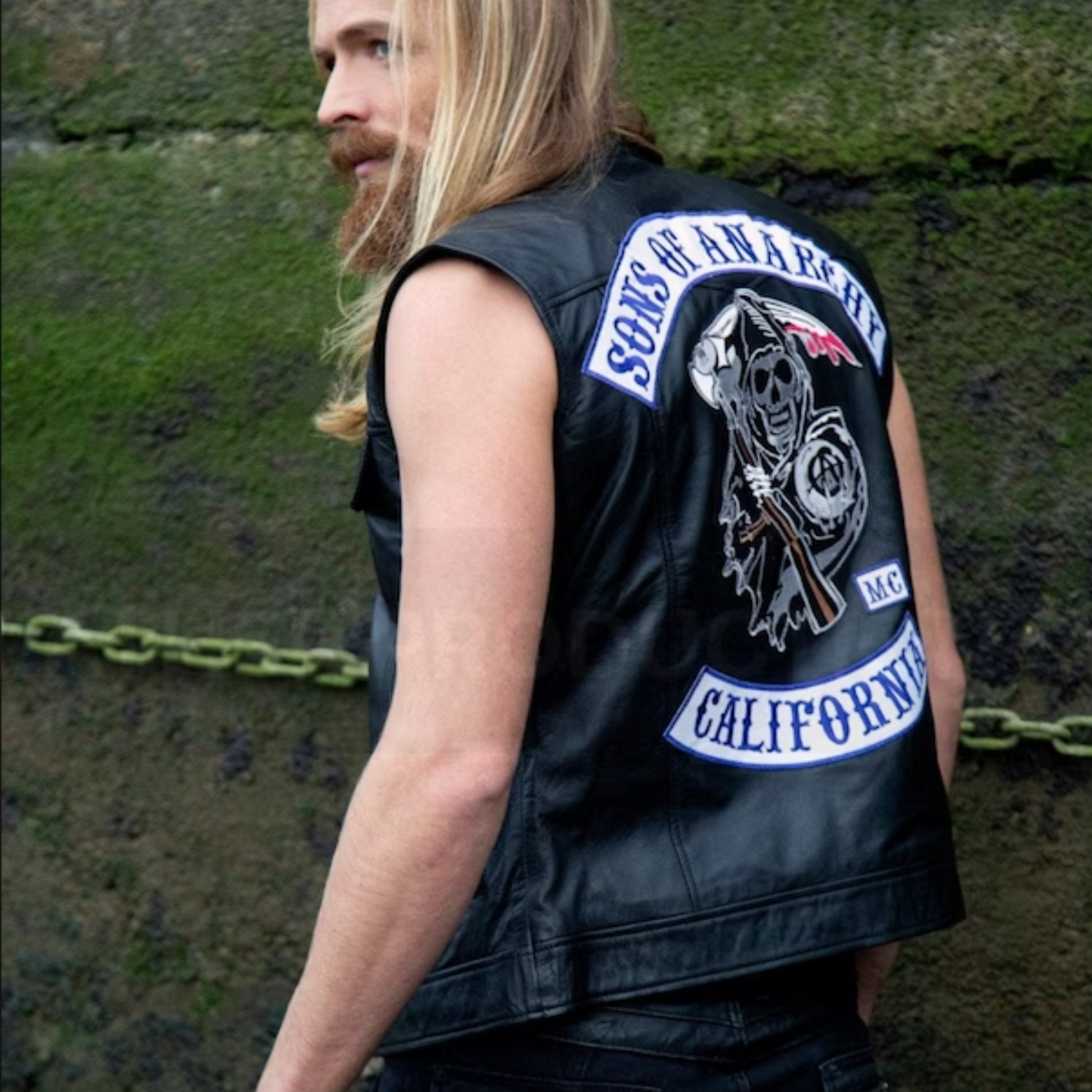 - This vest features a sleek black design adorned with striking blue patches, reminiscent of the signature look worn by Jax Teller in the acclaimed TV series.